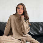 Amara představuje absolutní pohodlí s nádechem elegance. Tato sada pletených kalhot s rolákem spojuje měkký svetr s odpovídajícími kalhotami a vytváří tak harmonický, elegantní celkový vzhled. Elastický pletený materiál se příjemně přizpůsobuje pokožce a poskytuje volnost pohybu, aniž by ztratil tvar. Ideální pro uvolněné dny nebo stylové domácí chvíle – Amara je vzorovým příkladem komfortu a stylu.