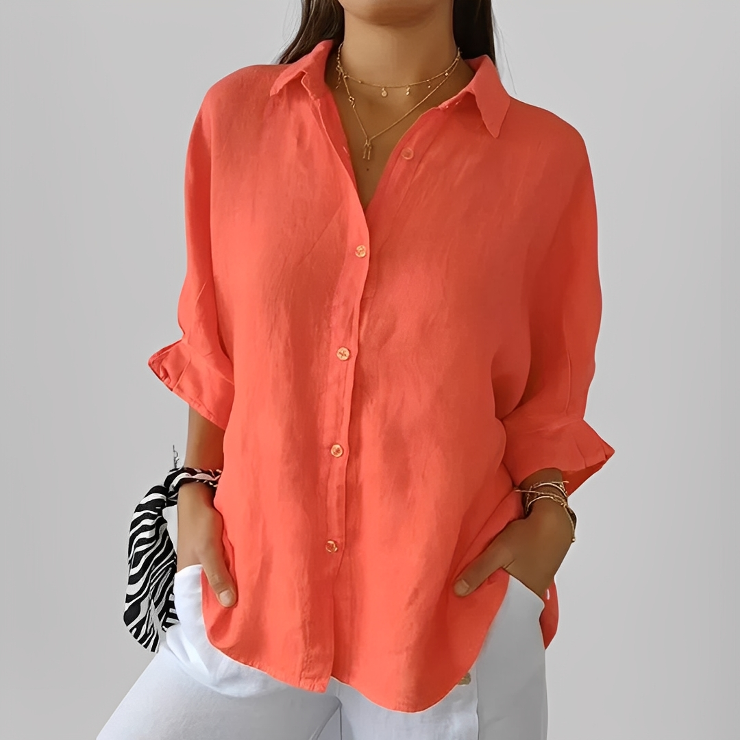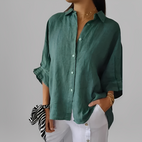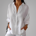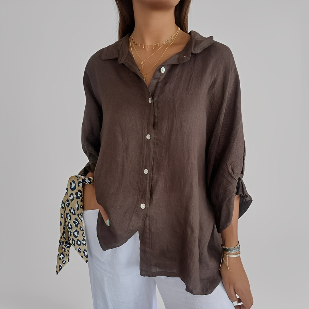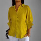 Tato stylová halenka Antoinete kombinuje pohodlí se stylem. Perfektní pro práci, volný čas nebo speciální akce. Je ušitá z měkké a dobře prodyšné látky a nabízí volný střih, který se hodí na každou postavu. Její design s knoflíky dodává nadčasovou a elegantní atmosféru. Lehká a snadno kombinovatelná, ideálně se nosí s džínami, sukní nebo úzkými kalhotami. Nabízíme ji v několika barvách a velikostech, aby vyhověla všem příležitostem.