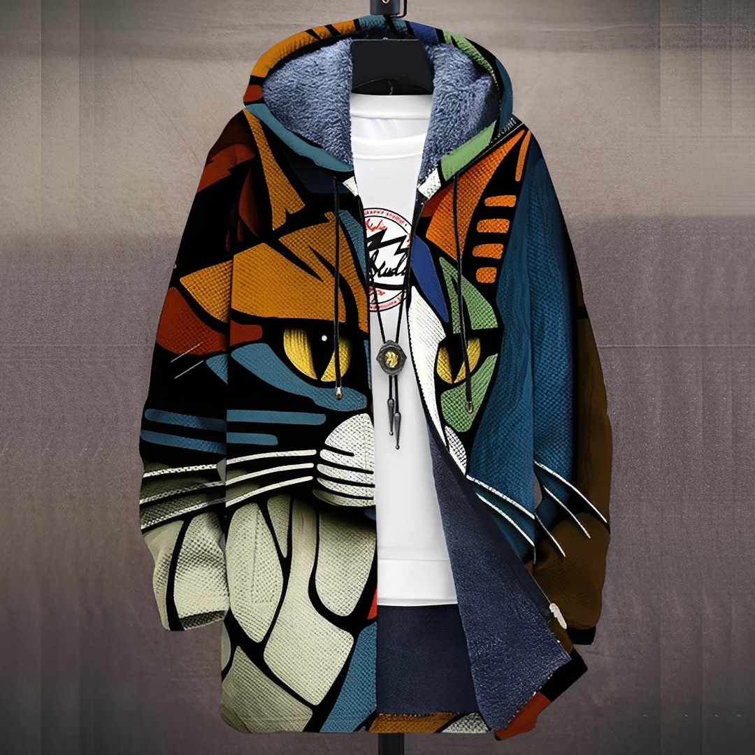 Odvážný design s komfortem: kabát Antonny je vytvořen pro muže, kteří chtějí snadno vyjádřit svůj módní vkus. Jeho nápaditý umělecký vzor dodá charakter každému outfitu, promění ležérní nebo formální oblečení v úžasný vzhled. Vyrobeno z kvalitních materiálů, zajistí teplo a pohodlí po celý den. Jeho univerzální střih je ideální k džínům, kalhotám nebo jako vrstvení a hodí se pro práci, výlety nebo speciální akce. S kabátem Antonny váš šatník získá kousek, který kombinuje kreativitu, styl a praktičnost.
