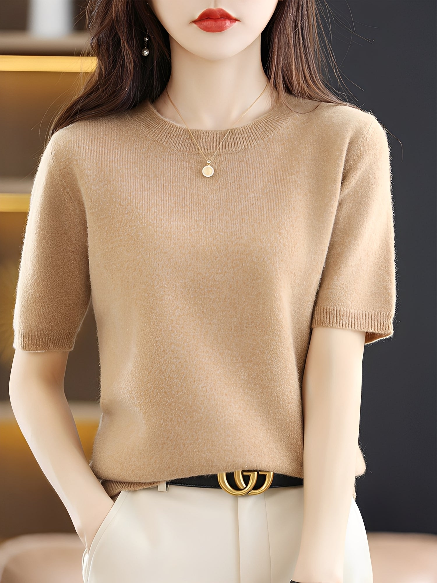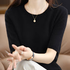 - Klasická a univerzální silueta — jeho kulatý výstřih a čistý design usnadňuje jeho kombinaci pro práci či volný čas.