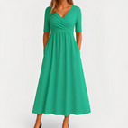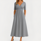 Dodejte šatníku šmrnc: tyto elegantní midi šaty s véčkovým výstřihem jsou vaším spojencem pro nadčasový styl a přirozenou eleganci.