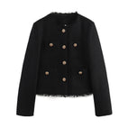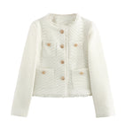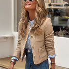 Krátké dámské sako Muriel z tvídu s knoflíky propojuje nadčasovou eleganci a nenucenou sofistikovanost. Navrženo pro přiléhavý a lichotivý střih, skvěle se hodí k kalhotám, sukni nebo džínům, ať už na práci nebo na víkendové výlety. Klasické knoflíkové zapínání dodává rafinovaný vzhled, zatímco texturovaný tvíd dodává hloubku a styl všem vašim outfitům. Lehká, ale strukturovaná látka zaručuje optimální pohodlí a zároveň zachovává elegantní siluetu. Nezbytný univerzální oděv pro ženy, které hledají styl, pohodlí a sebevědomí.